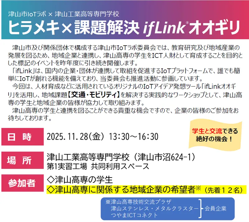 この度津山高専で開催された「ヒラメキ×課題解決 ifLinkオオギリ(津山市IoTラボ委員会主催)」の開催にあたり、当社の社員がファシリテーターを務めさせて頂きました。
